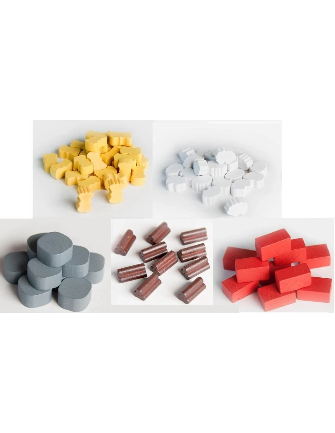 Yucatan fiches set voor 3-4 personen. Bevat 19 stuks hout, steen, schaap, erts en graan. Perfect om de grondstofkaartjes van Kolonisten van Catan te vervangen.